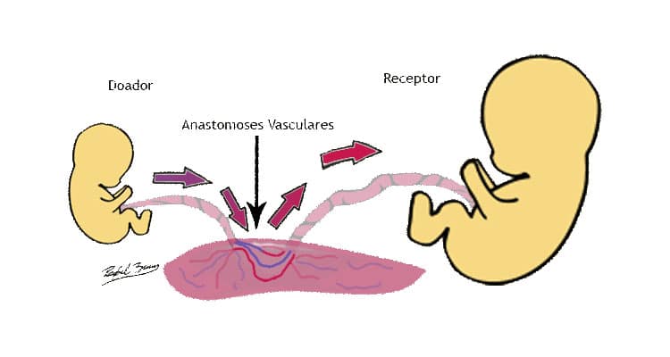 Ilustração das anastomoses (ligações) vasculares entre os fetos. O fluxo sangüíneo vai preferencialmente de um feto (doador) para o outro (receptor). Nesta ilustração a placenta, o cordão e alguns vasos estão apagados. As anastomoses (indicadas com a seta) estão em maior realçe.